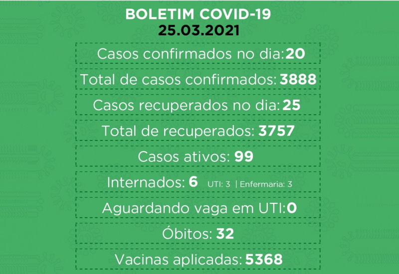 No total, 3888 pessoas foram confirmadas com a doença no município, das quais 3757 já se recuperaram e 99 estão com o vírus ativo.