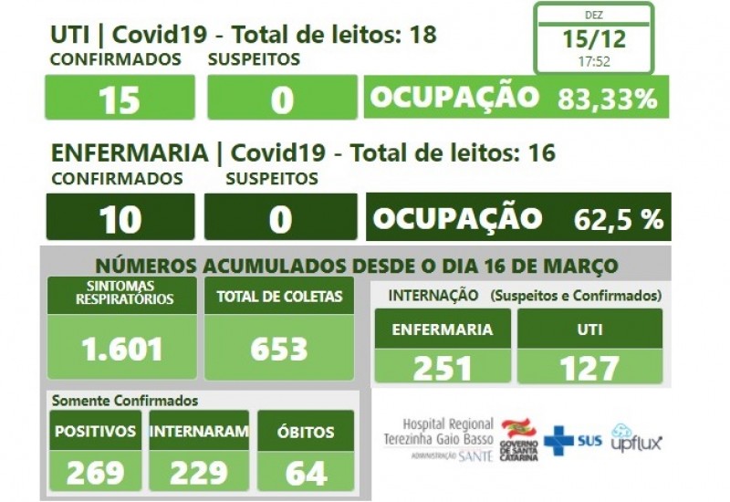A ocupação de hoje é de 15 pacientes confirmados na UTI. Na enfermaria é de 10 confirmados.