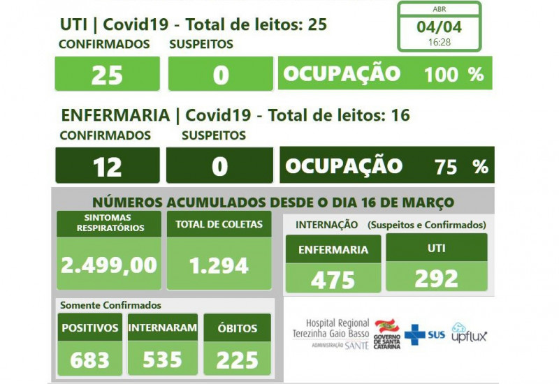 No domingo ainda foram registradas 4 transferências de pacientes de Bom Jesus do Oeste, Dionísio Cerqueira, Jupiá e Cunha Porã que aguardavam leito de UTI, ambos para Chapecó. A ocupação de hoje é de 25 pacientes confirmados na UTI. Na enfermaria são 12 confirmados.