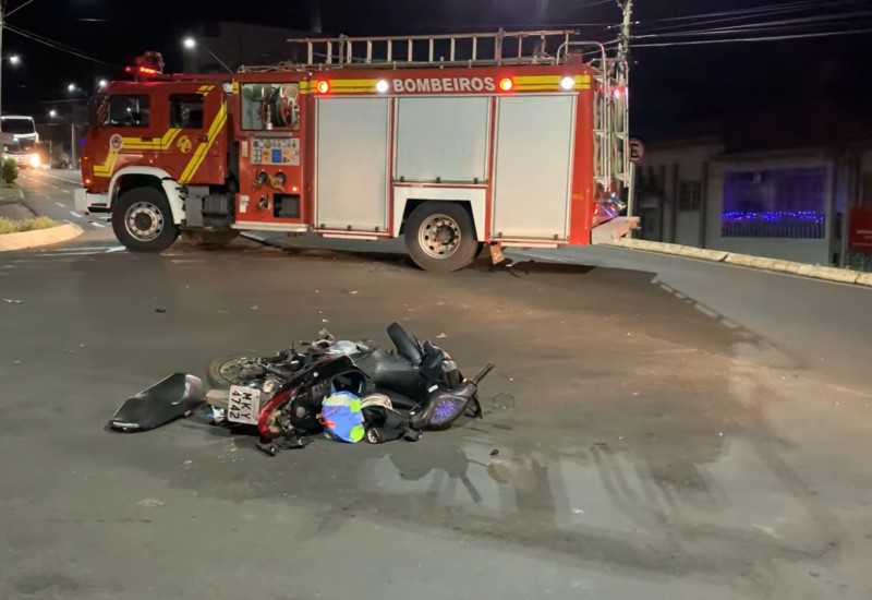 O Corpo de Bombeiros foi acionado e atendeu uma feminina, maior, condutora de motocicleta. A mesma estava sentada em via pública, já sem capacete, consciente e orientada, apresentando escoriações no membro inferior esquerdo, região do tornozelo, queixando-se de dores no ombro direito, com mobilidade.