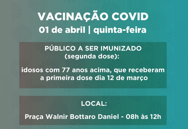 Idosos de 77 anos acima que receberam a primeira dose da vacina contra covid-19 no último dia 12 de março, em São Miguel do Oeste, devem comparecer à Praça Walnir Bottaro Daniel na manhã desta quinta-feira (01), das 08h às 12h, para tomarem a segunda dose do imunizante.