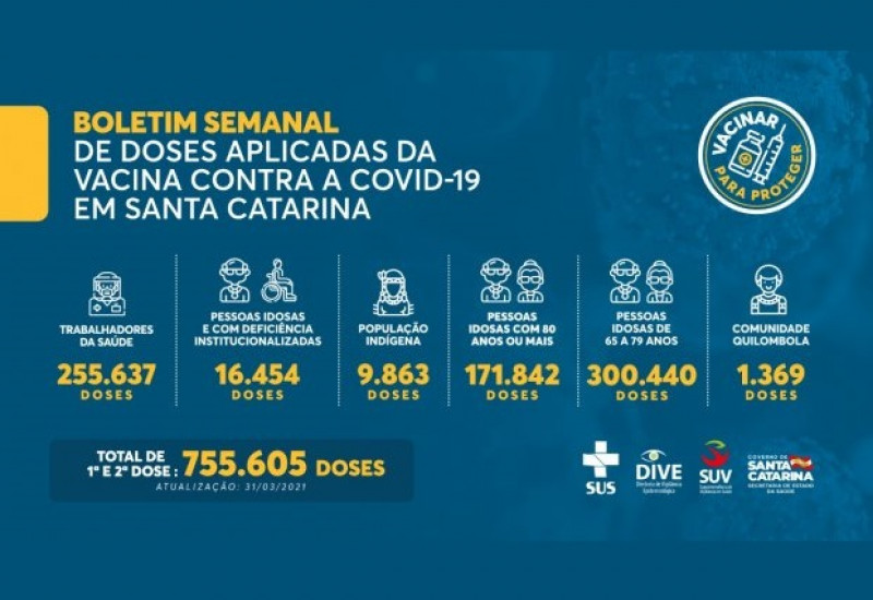 Santa Catarina aplicou mais 54.994 doses da vacina contra a Covid-19 nos grupos prioritários, em um comparativo com o boletim divulgado na segunda-feira, 29, e soma 755.605 doses aplicadas desde o início da Campanha de Vacinação. Os dados são do Balanço Parcial de Vacinação contra a Covid-19 divulgado nesta quarta, 31, pela Secretaria de Saúde de Santa Catarina. Do total de doses aplicadas, 608.970 correspondem à primeira dose (D1) e 146.635 à segunda 2 (D2).