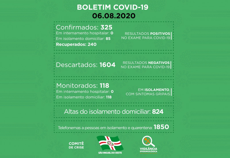 Ao todo, 325 pessoas foram confirmadas com a doença em São Miguel do Oeste, das quais 240 estão recuperadas e 85 continuam com o vírus ativo, todas em isolamento domiciliar.