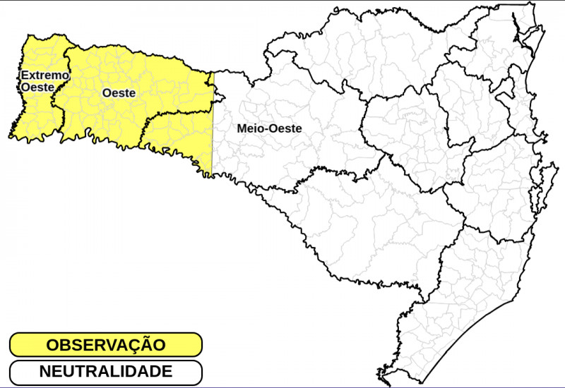 Conforme o órgão estadual, no decorrer dos próximos dias o tempo firme e seco predomina devido à atuação da alta pressão. No período da tarde desta terça, nas regiões em amarelo – Meio-Oeste, Oeste e Extremo Oeste – a umidade relativa do ar deve ficar abaixo de 30%, conforme indica o mapa.