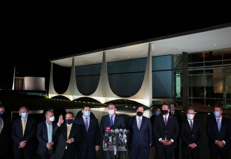 “Em que pese a pandemia, o Brasil está indo bem, a economia está reagindo e nós aqui resolvemos, então, com essa reunião, direcionar mais ainda nossas forças para o bem comum daquilo que todos nós defendemos. Nós queremos o progresso, o desenvolvimento, o bem-estar do nosso povo. Nós respeitamos o teto dos gastos, queremos a responsabilidade fiscal e o Brasil tem como ser realmente um daqueles países que melhor reagirá à questão da crise”, afirmou Bolsonaro. Pela manhã, o presidente já havia se manifestado em defesa das privatizações e de uma agenda de controle dos gastos públicos.