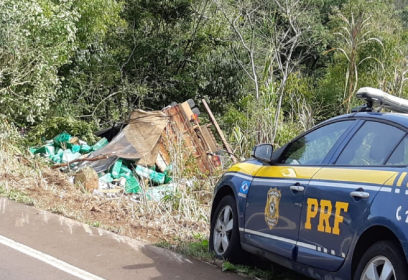 Um caminhão Volkswagen/23.220, com placas adulteradas, e transportando uma carga de cigarros contrabandeados, tombou durante uma perseguição policial nesta quarta-feira (22). O veículo foi abordado pela Polícia Rodoviária Federal (PRF) em uma barreira montada na ERS-472, em Tenente Portela/RS.