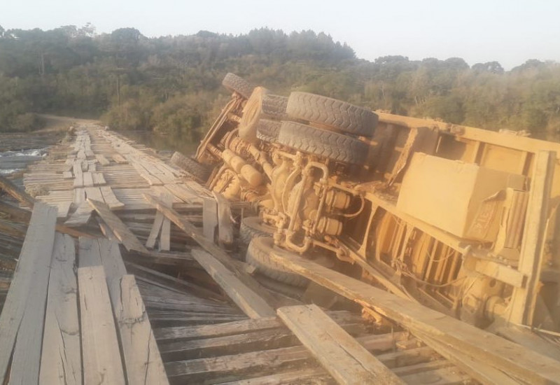carregado com madeiras, caiu no Rio Chapecó depois que uma ponte não resistiu