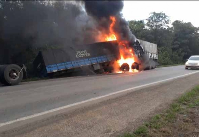 Uma carreta bi-trem com placas de Campo Erê/SC pegou fogo na noite desta quinta-feira (19), na rodovia BR 174 em Comodoro/MT, a menos de 300 quilômetros de Vilhena/RO, onde era o destino final.