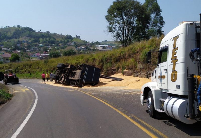 Na tarde desta sexta-feira (04), a Polícia Militar Rodoviária atendeu na SC 161, em Romelândia, um tombamento do caminhão Volvo/FH 460, e um semi reboque, emplacado em Boa Vista do Sul/RS.