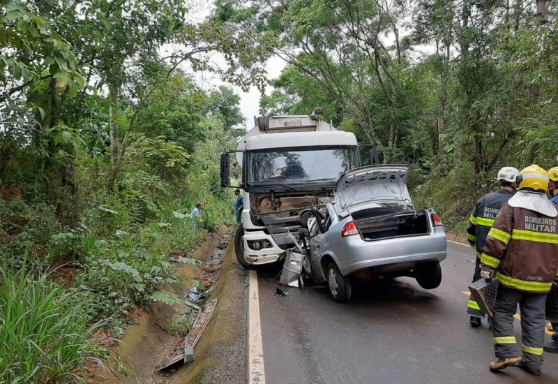 Os dois veículos colidiram frontalmente, levando a óbito ainda no local um casal que estava no carro pequeno. Os corpos do motorista e da caroneira, identificados como Gilvano Possa e Juliana Alebrandt, ficaram presos nas ferragens. A mulher deixa dois filhos e motorista três.