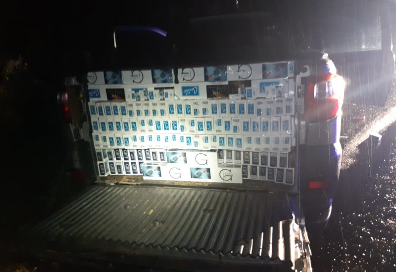 Dentro da caminhonete os policiais encontraram 20.000 maços de cigarros contrabandeados do Paraguai, marca Caribe e Gift. Havia cigarro na caçamba, no compartimento do estepe e no compartimento do passageiro.