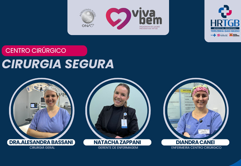 No Programa Viva Bem de hoje, a gerente de Enfermagem do Centro Cirúrgico, Natacha Zappani, a enfermeira Diandra Canei e a cirurgiã Alesandra Bassani apresentam dados do setor, os protocolos de cirurgia segura e também orientações importantes a todos que venham a realizar procedimento cirúrgicos no HRTG-Santé.