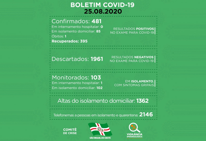 No total, 481 pessoas foram confirmadas com a doença no município, das quais 395 já se recuperaram.