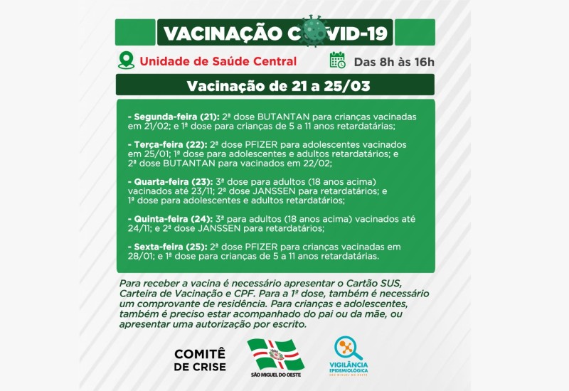 - Sexta-feira (25): 2ª dose PFIZER para crianças vacinadas em 28/01; e 1ª dose para crianças de 5 a 11 anos retardatárias.