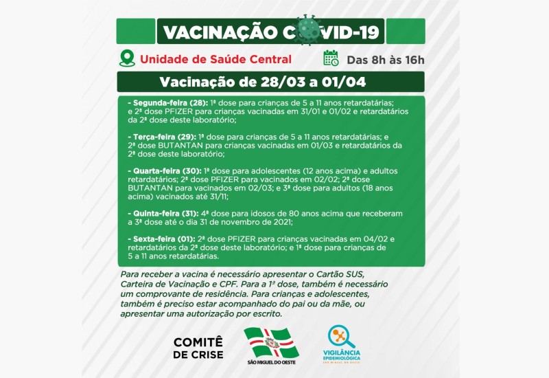 - Sexta-feira (01): 2ª dose PFIZER para crianças vacinadas em 04/02 e retardatários da 2ª dose deste laboratório; e 1ª dose para crianças de 5 a 11 anos retardatárias.