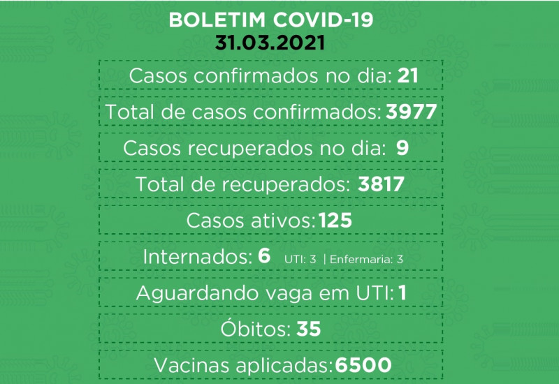 No total, 3977 pessoas foram confirmadas com a doença no município, das quais 3817 já se recuperaram e 125 estão com o vírus ativo.