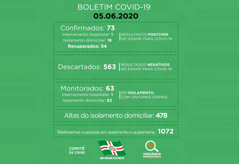 Com isso, 73 pessoas foram diagnosticadas com o coronavírus até o momento no município, das quais 19 seguem com a doença, uma delas em internação hospitalar.