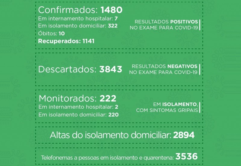 No total, 1.480 pessoas foram confirmadas com a doença no município, das quais 1.141 já se recuperaram e 329 estão com o vírus ativo.