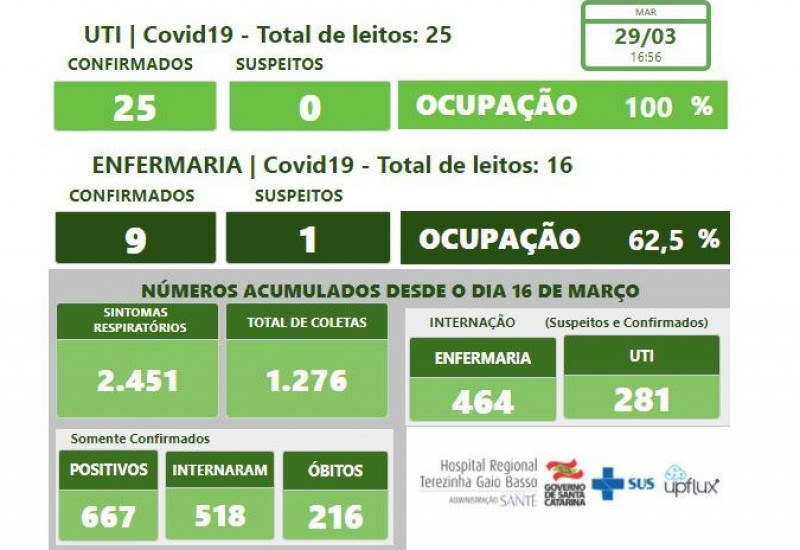 A ocupação de hoje é de 25 pacientes confirmados na UTI. Na enfermaria são 9 confirmados e 1 suspeito.