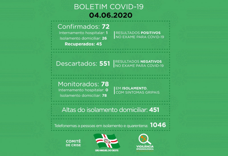 Mais dois homens e duas mulheres foram confirmados com covid-19, nesta quinta-feira (04), em São Miguel do Oeste.