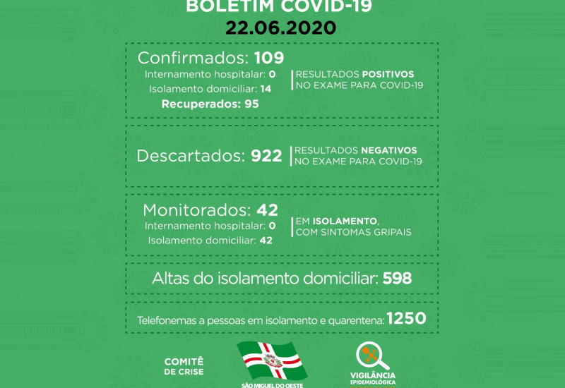 Cinco novos casos de covid-19 foram confirmados nesta segunda-feira (22), em São Miguel do Oeste. Foram três mulheres e dois homens.