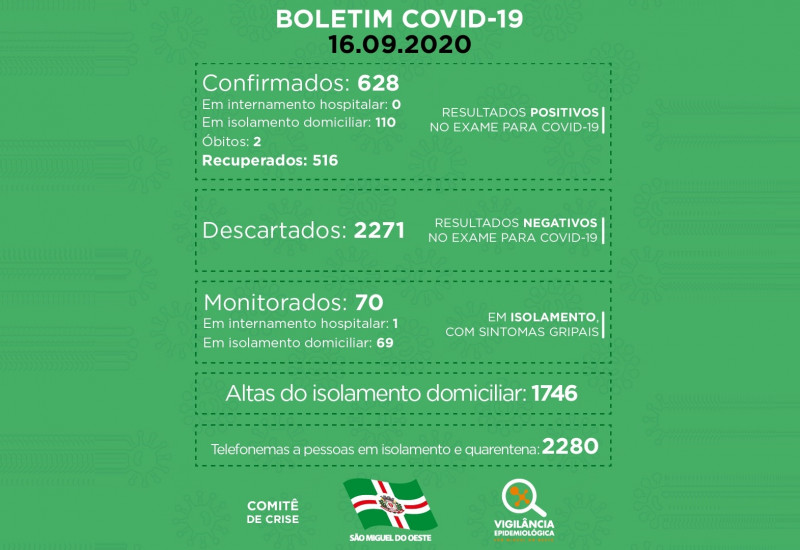 No total, 628 pessoas foram confirmadas com a doença no município, das quais 516 já se recuperaram e 110 estão com o vírus ativo.