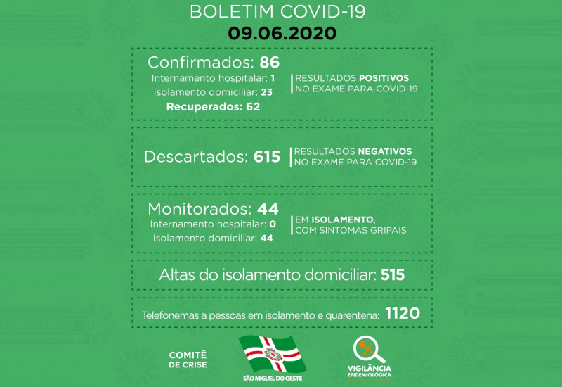 Novo boletim epidemiológico mostrou nesta terça-feira (09), que de ontem para hoje, 46 pessoas foram testadas para covid-19 em São Miguel do Oeste, entre pacientes sintomáticos e trabalhadores da saúde.
