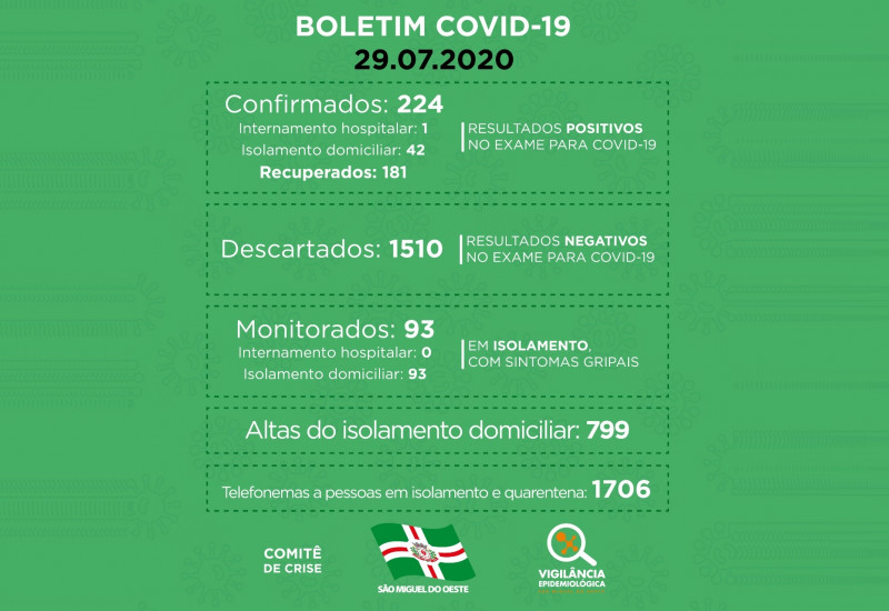 O número total de pessoas já confirmadas com a doença no município está em 224, das quais 181 estão recuperadas, e 43 continuam com o vírus ativo.