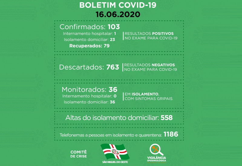 Com isso, o município chega a 103 casos já confirmados, e 79 recuperados.