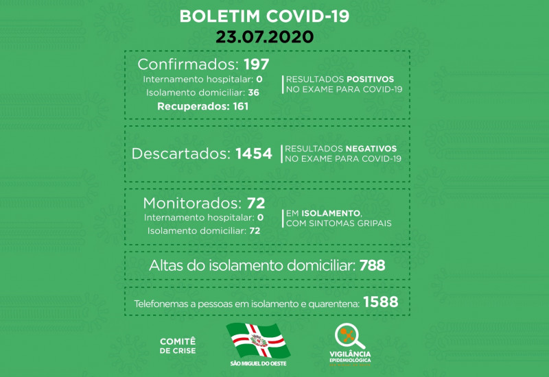 Cabe ressaltar que 161 pessoas já estão recuperadas, e 36 permanecem em isolamento domiciliar.