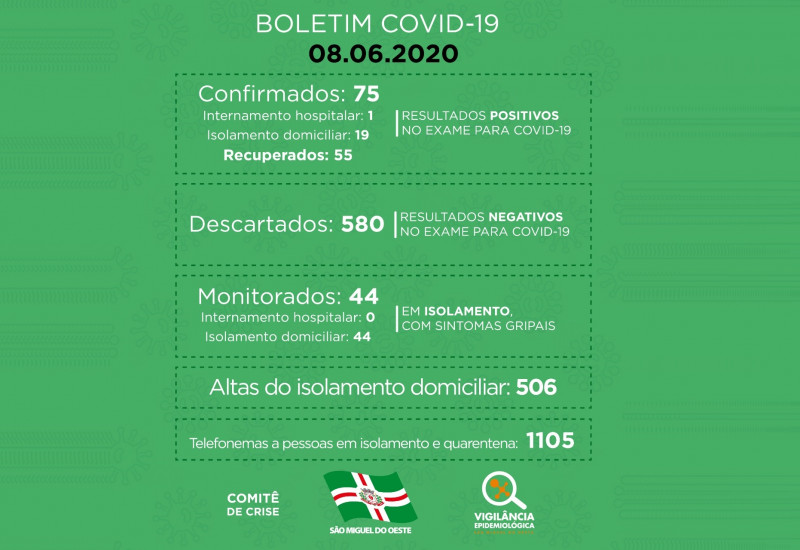 Até o momento, 75 pessoas foram confirmadas com o coronavírus no município, sendo 55 já recuperadas e 20 ainda ativas.