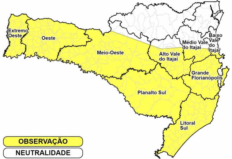A Defesa Civil emitiu alerta de temporais para grande parte de Santa Catarina, das 12h desta quarta (16) até o mesmo horário de quinta-feira (17).