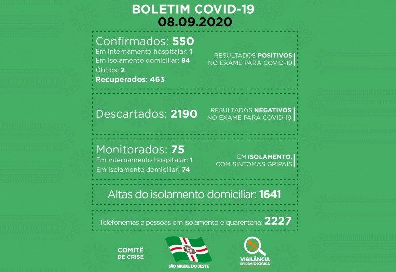No total, 550 pacientes foram confirmados com a doença no município, das quais 463 já se recuperaram e 85 estão com o vírus ativo.