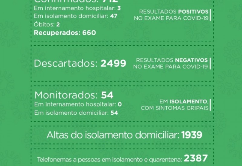No total, 712 pessoas foram confirmadas com a doença no município, das quais 660 já se recuperaram e 52 estão com o vírus ativo.