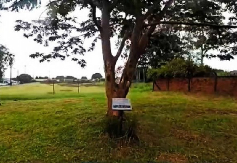 A prefeitura colocou uma placa no pé da árvore, para evitar