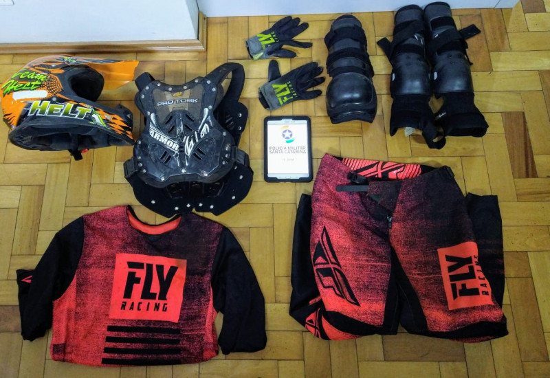 Foi efetuado a abordagem, e o homem estava de posse dos objetos furtados, um capacete, roupa de motocross (que o mesmo estava usando), joelheiras, cotoveleiras, luvas e colete.