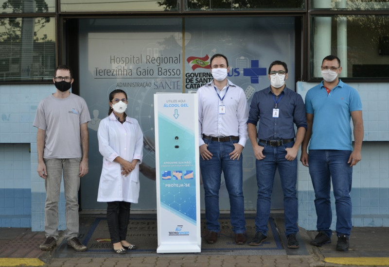 Estavam presentes para a entrega o responsável pela industrialização do totem, Fernando Henrique Finger, da TecnoFinger, e o responsável pela comercialização na região do Extremo Oeste, Silvio Fagundes da Higimix.