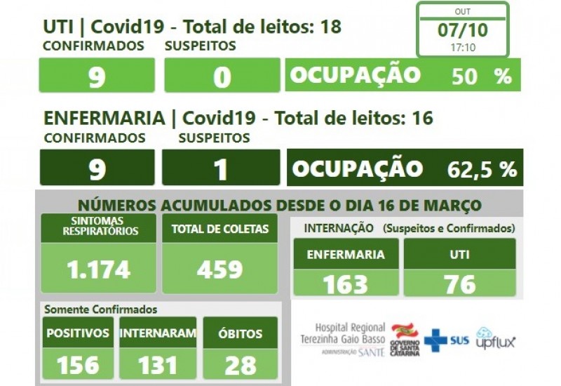 Ainda no dia de hoje, o hospital registrou uma alta hospitalar de paciente de Guaraciaba. A ocupação de hoje é de 9 pacientes confirmados na UTI. Na enfermaria são 9 positivos e 1 suspeito.