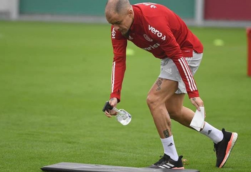 Jogadores passaram por avaliação médica, com testagem da temperatura corporal e outros dados para saber a situação de saúde de cada um. D’Alessandro aparece em uma imagem limpando um colchonete do tipo utilizado em academias, que servem para realizar exercícios deitados, com um frasco com um líquido.