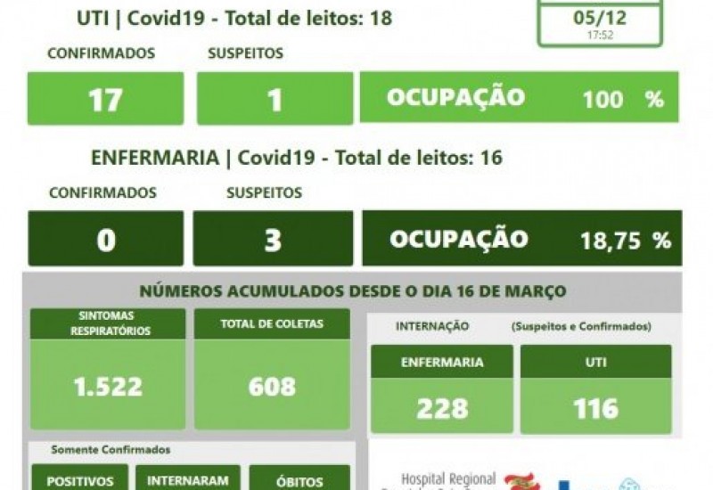 O Hospital Regional Terezinha Gaio Basso de São Miguel do Oeste informou ainda no sábado (05), que está com a capacidade das UTIs destinadas ao Covid-19 esgatadas. Dos 18 leitos disponíveis para o Covid-19, 17 são de pacientes confirmados com o vírus e um caso é suspeito.