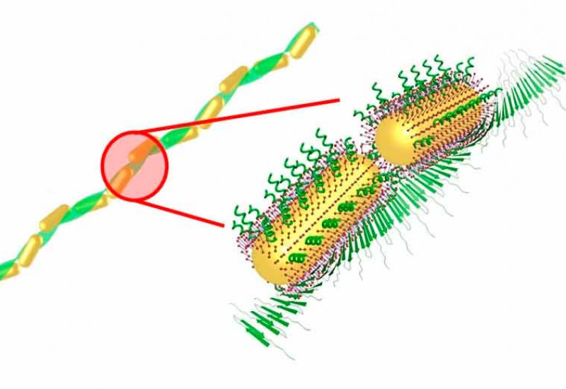 relata que a interação entre os nanobastões de ouro e os peptídeos amiloides
