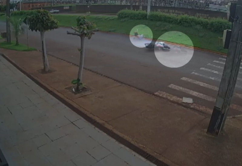 Uma câmera de monitoramento registrou quando o motociclista caiu do veículo e a moto deslizou pela avenida.