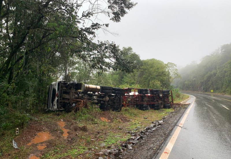 ferido após um caminhão sair da pista e tombar, às margens da BR-282, em
