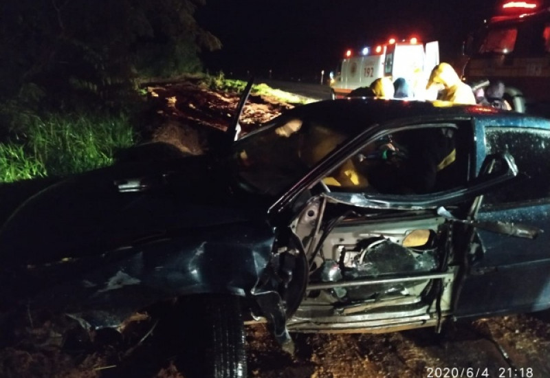 Motorista precisou ser retirado de veículo pelos Bombeiros em acidente contra caminhão
