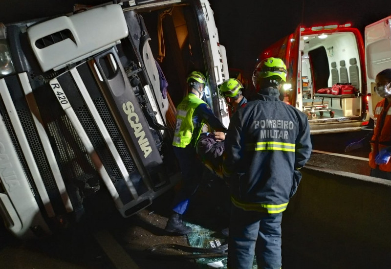 A guarnição atendeu a vítima, que relatou dores em várias partes do corpo, mas sem lesões aparentes. O motorista precisou da ajuda dos bombeiros para sair da cabine. Ele foi levado para o Hospital Regional São Paulo.