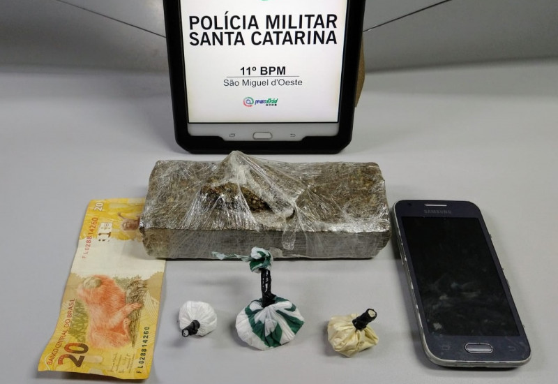 Durante as buscas foram localizadas 300 gramas de maconha e 20 gramas de cocaína. O cidadão informou que adquiriu a droga em Chapecó/SC e teria pago o valor de R$ 1.340,00. O homem foi preso em flagrante e o celular e o veículo suspeito de estar sendo utilizado na prática delitiva foram apreendidos.