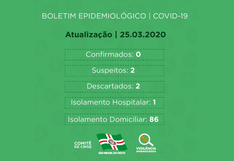 Até o momento existem no município dois casos suspeitos, outros dois casos já haviam sido descartados. O mesmo balanço ainda aponta um caso de isolamento hospitalar e 86 casos de isolamento domiciliar.