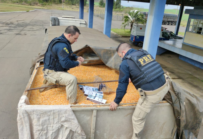 Os PRFs desconfiaram da carga e fizeram uma inspeção minuciosa, descobrindo que embaixo da carga de milho em grãos havia grande quantidade de caixas de cigarros contrabandeados do Paraguai.
