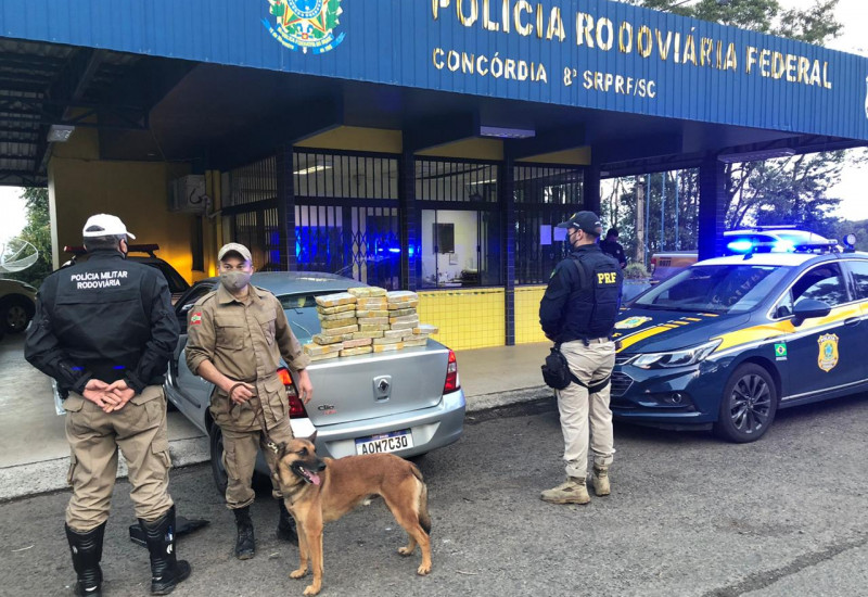 Durante a fiscalização os policiais desconfiaram que o veículo transportava droga e pediram apoio do canil da Polícia Militar de Concórdia para confirmar a suspeita. O cão acusou no porta malas a possível presença de drogas.