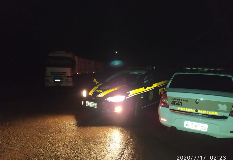 O motorista tentou fugir, mas foi preso pelos policiais. O bitrem já estava com placas falsas. O motorista e o veículo foi encaminhado para a Polícia Civil.